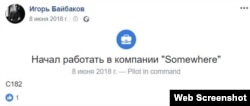 • 8 июня. Байбаков отмечает в Фейсбуке, что начал работать на новом месте (оригинал поста, сохраненная копия). Название компании он не называет, заменяя его на таинственное "Somewhere" ("Где-то"), но пишет в посте "С182" – так сокращенно обозначают модель одномоторного самолета Cessna 182, одной из самых популярных и массовых машин в истории мирового авиастроения (с 1956 года выпущено более 25 тысяч единиц).